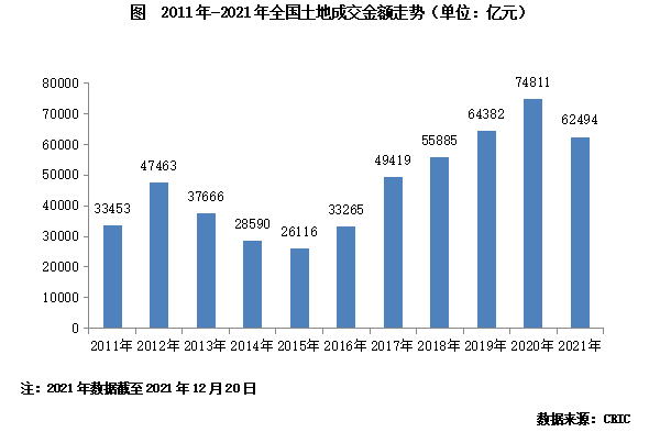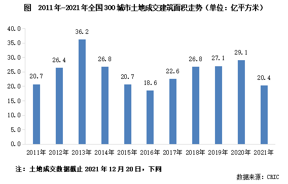 截止2021年12月20日,全國300城土地市場成交建筑面積20.4億平方米,較2020年同期下降了24%。考慮到集中供地政策之下土地市場成交規模明顯收縮,12月下旬成交量將遠不及去年同期,預計2021年土地市場總量將難以超越2020年的水平,并且全年成交規模同比降幅較目前將繼續擴大,全年降幅大概率將超過25%。