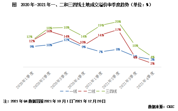 四季度也基本延續了三季度的下降之勢,整體溢價率降至3%。分能級來看,各能級溢價率均已經跌破5%。其中,一線城市溢價率降至3%,二線城市中杭州、武漢、長沙等首輪土拍熱度較高的城市在第二輪土拍中均遭遇了大面積寒潮,導致平均溢價率進一步走低,溢價率降至2%,三四線城市亦難逃脫降溫趨勢,2021年第四季度溢價率僅有4%,降至歷史新低。