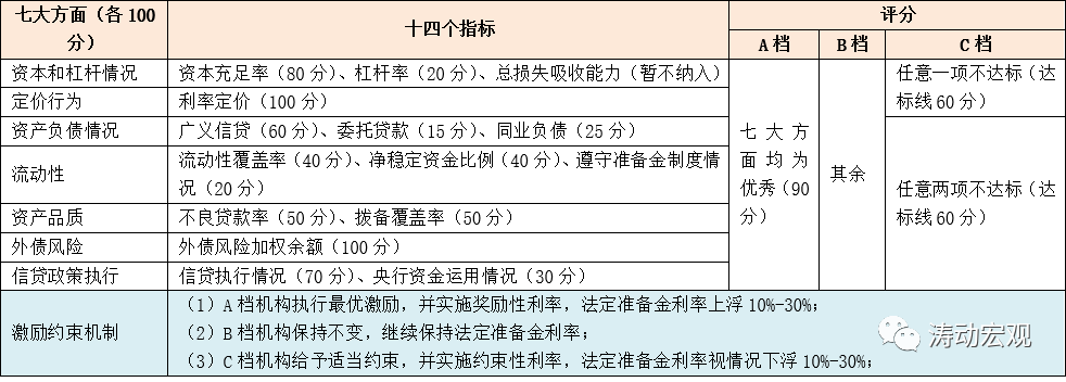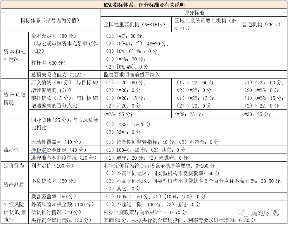 (二)MPA評估的指包括資本和杠桿情況、資產負債情況、流動性、定價行為、資產質量、跨境融資風險、信貸政策執行等七大方面約14個指標。根據宏觀調控需要,人民銀行可對指標構成、權重和相關參數、評分方法等進行調整。 實際上近年來,MPA體系的內涵在不斷豐富,覆蓋范圍和適用對象持續擴大。