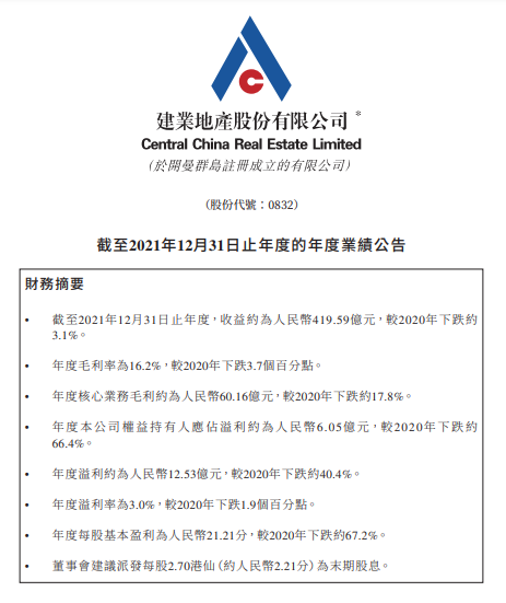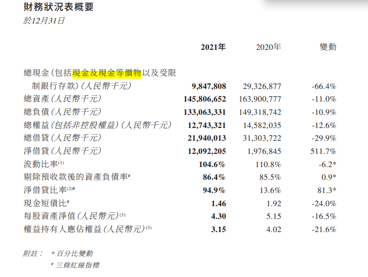 根據其2021年年報,建業地產現金及現金等價物59.02億元,加上受限制銀行存款后,總現金98.48億元,同比下降66.4%。