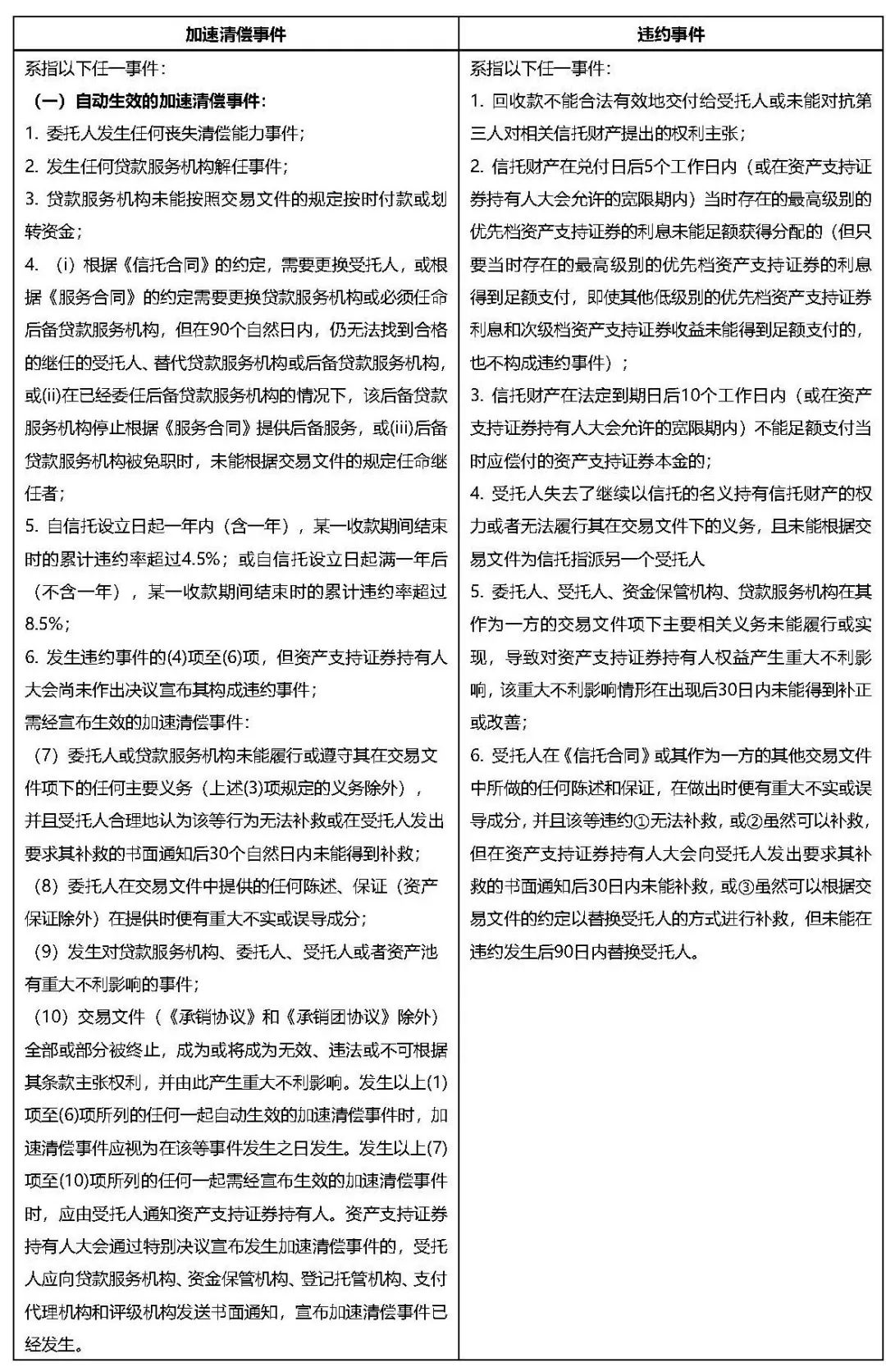 加速清償事件和違約事件均屬于信用觸發事件的范疇。信用觸發事件是指在不利于優先級資產支持證券償付的情況達到一定觸發條件后引發的事件,根本目的是當資產池質量發生負面變化時,通過改變現金流支付機制的重新安排讓基礎資產現金流首先保障優先檔證券的本息兌付。加速清償事件一般同參與機構履約能力、資產支持證券兌付相關;違約事件一般同資產支持證券兌付相關的違約事件。