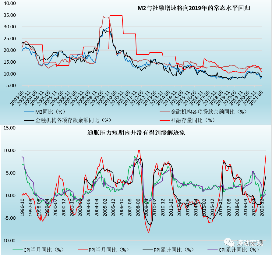 截至2021年5月,社融、M2、存款與貸款增速已分別降至11%、8.30%、8.90%和12.20%,較2020年同期均有明顯下降。我們認為,考慮到M2與社融已接近潛在名義經濟增速水平,預計下半年上面四個指標還會有約0.50個百分點左右的下降空間,回歸至2019年的常態水平。