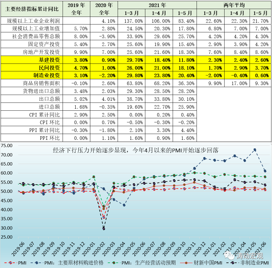 2、從三駕馬車的表現來看,消費與投資等內需整體上仍處于低位緩慢修復態勢,房地產投資與貿易端延續了2020年的表現,對上半年的經濟修復貢獻力度較大,如1-5月的房地產投資累計同比、貨物進出口總額累計同比分別達到8.60%和28.20%。其中,房地產投資累計同比的兩年平均值高達8.60%,1-5月民間投資與制造業投資累計同比的兩年平均值則分別為3.70%和0.60%,較2019年的水平還有不少距離。同時PPI上行壓力亦比較大,但CPI弱勢仍比較明顯。