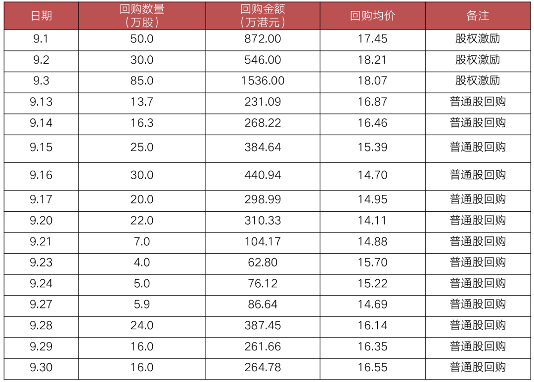 尤其是新城悅服務(wù),自7月6日開始,新城悅服務(wù)持續(xù)用“股份激勵(lì)計(jì)劃的受托人買入”和“公司回購”兩種方式從二級市場買入公司股份。其中,9月份回購次數(shù)16次,涉及金額6131.83萬港元。