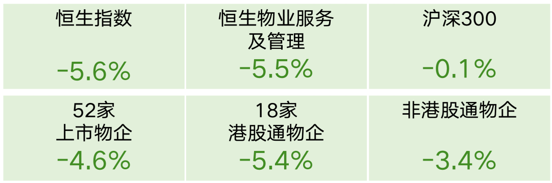截至2021年9月,恒生指數(shù)下跌5.6%,滬深300下跌0.1%,恒生物業(yè)服務(wù)及管理指數(shù)下跌5.5%,均出現(xiàn)下降。同時(shí),52家上市物企股價(jià)下跌4.6%,非港股通上市物企下跌3.4%, 18家港股通物企下跌5.4%。