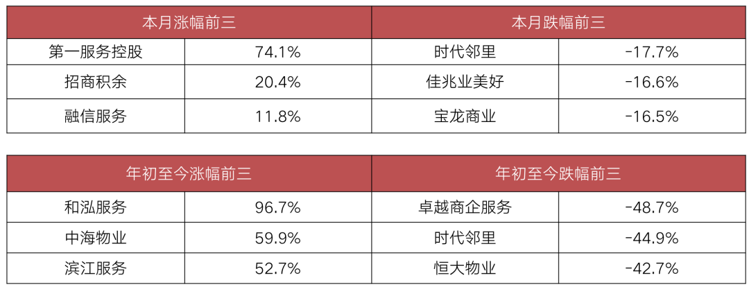 其中,本月股價(jià)漲幅前三的物企分別為第一服務(wù)控股、招商積余和融信服務(wù);跌幅最多的三家物企分別為時(shí)代鄰里、佳兆業(yè)美好和寶龍商業(yè)。