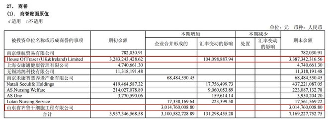 一個是2014年收購英國百貨公司HOF產生的商譽,加上后來匯率波動的影響截止2017年底,這部分的商譽余額是33.87億元。一個是2017年并表齊魯干細胞新增商譽約30.15億元。以下為公司2017年年報中披露的商譽明細情況: