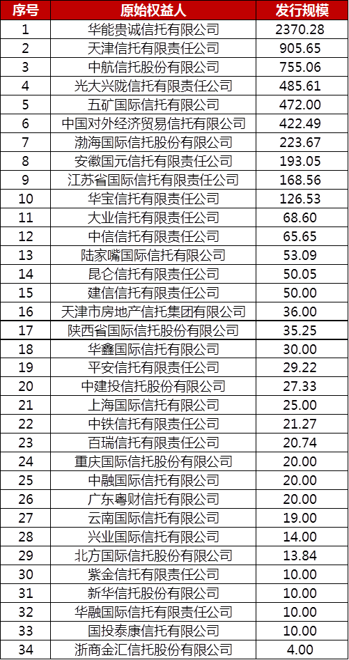據不完全統計,信托公司作為原始權益人角色的ABS產品合計520只,規模合計6795.94億元,其中排名前五的信托公司為華能貴誠信托、天津信托、中航信托、光大信托和五礦信托,規模分別為2370億元、906億元、755億元、485億元和472億元,具體參見圖表2。
