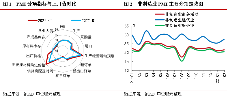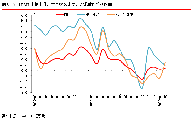 一,PMI小幅上行,新訂單指數重回擴張區間,需求強,生產弱,預期強。2月PMI指數為50.2%,小幅上升0.1個百分點,非制造業商務活動指數為51.6%。受季節性和春節因素影響,生產指數為50.4%,比上月下降0.5個百分點,生產雖小幅放緩但仍高于臨界點;生產經營活動預期為58.7%,較上月大幅增加1.2個百分點,穩增長預期強。新訂單指數為50.7%,比上月上升1.4個百分點,需求端時隔6個月重回擴張區間。主要原材料購進價格和出廠價格大幅上漲。