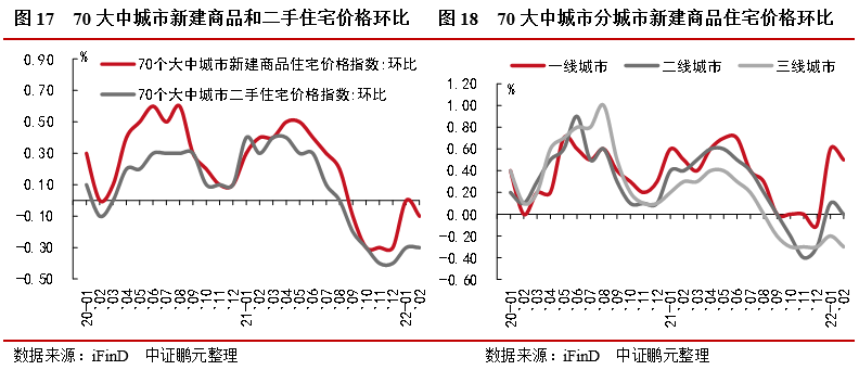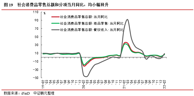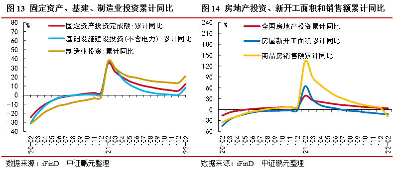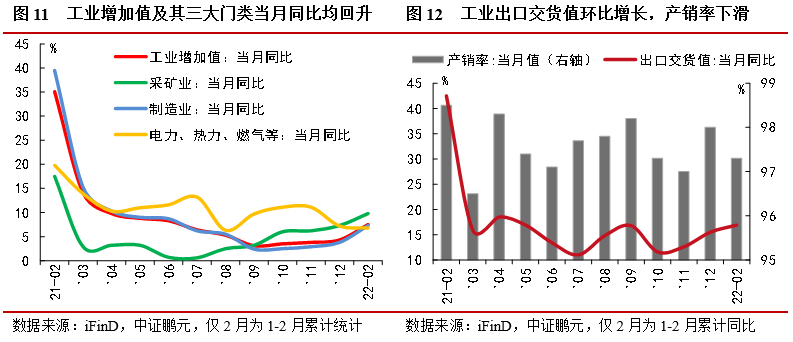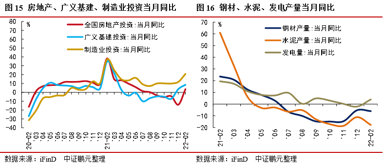 五,制造業投資保持兩位數增長,基建投資有所好轉,房地產投資雖有上升但銷售和開工仍低迷。1-2月份,制造業投資增速為20.9%,主要受基數影響。狹義基建投資增速8.1%,比2021年全年加快7.7個百分點,比2021年12月高8.7個百分點。廣義基建投資增速為8.6%,比2021年12月高4.8個百分點,基建投資增速回暖,因穩增長背景下,政策發力靠前。房地產投資當月同比大幅回暖,商品房銷售和房屋新開工不景氣,鋼材、水泥產量負增長進行了驗證。