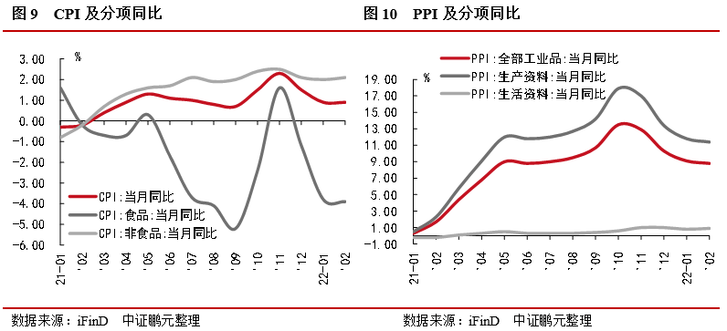 三,CPI同比持平走低,環比漲幅略有擴大;PPI同比繼續回落,環比由跌轉升,警惕輸入性通脹風險。CPI同比上漲0.9%,與上月持平,核心CPI同比上漲1.1%,漲幅比上月回落0.1個百分點,CPI環比上漲0.6%,漲幅比上月擴大0.2個百分點。PPI同比上漲8.8%,環比上漲0.5%。近期俄烏沖突地緣政治影響下原油等大宗商品大幅上漲,疫情造成的產業鏈未完全恢復,警惕輸入性通脹風險,今年CPI預計溫和上漲,PPI預計逐漸回落。