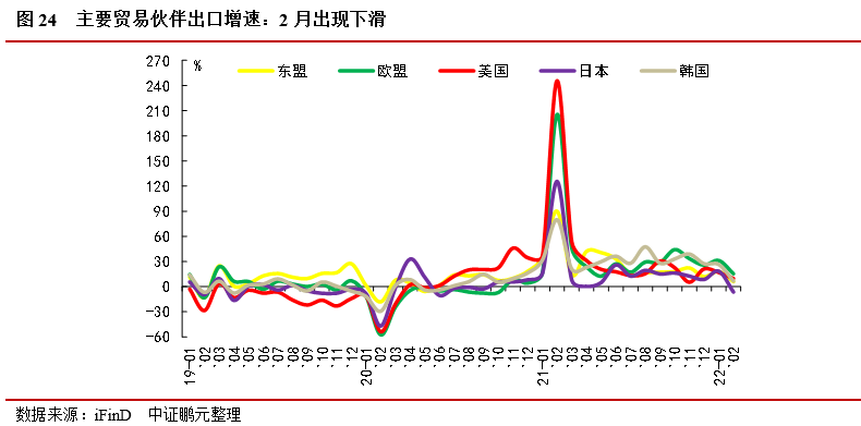 八,出口邊際放緩但仍具韌性,RCEP紅利釋放。按美元計,2月出口增長6.2%,進口增長10.4%,出口增速自2021年以來首次跌到個位數,回落的主要原因有季節性和去年同期基數高的原因。綜合1-2月來看,出口增長24.1%,進口增長19.8%,雖有下滑,仍保持著兩位數增長,隨著RCEP紅利持續釋放,關稅優惠凸顯,企業積極性高,出口具有一定韌性。歐盟、東盟、美國為前三大主要貿易伙伴,對主要貿易國增速出現下滑。