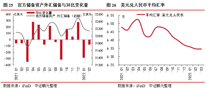 九,2月外匯儲備規模為32, 138億美元,環比降幅為0.24%,美元兌人民幣匯率整體穩定。受地緣政治局勢、主要國家貨幣政策預期轉向加快等因素影響,外匯儲備規模下降。從目前來看,人民幣匯率整體還在合理運行區間。