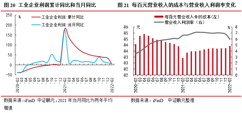 1-2月份,全國規模以上工業企業實現利潤總額11,575.6億元,同比增長5.0%,增速較去年12月份回升0.8個百分點。按可比口徑來看,1-2月工業企業利潤較去年12月當月同比下滑7個百分點(去年12月兩年平均增速為12.0%),主因2021年高基數影響。總體來看,工業企業效益狀況延續了去年以來的恢復態勢。工業企業利潤增速受基數較高影響較去年全年明顯回落,企業成本壓力加大,利潤率和產銷銜接水平均有所下降;企業盈利改善仍不均衡,下游行業尤其是中小微企業利潤增長緩慢,企業生產經營還面臨不少困難和挑戰,工業企業效益狀況持續恢復的基礎仍不牢固。