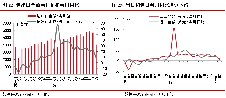 2022年1月1日,全球最大的自貿區RCEP正式生效,RCEP紅利釋放,關稅優惠凸顯,企業積極性高,前2月進出口保持一定增長,后續具有韌性。影響出口增長不利因素一是俄烏沖突等導致大宗商品價格上漲,壓縮企業利潤,地緣政治將會持續干擾。另一方面是新冠疫情的影響,此前中國的動態清零措施和防疫的成功經驗為出口增加了有利條件,但此次奧密克戎2.0具有高傳染性和低致死率,在國外普遍放開的情況下,我國的動態清零政策面臨挑戰和壓力,隨著主要出口國家供應鏈的恢復,在內外交困下,我國出口將面臨下滑趨勢。