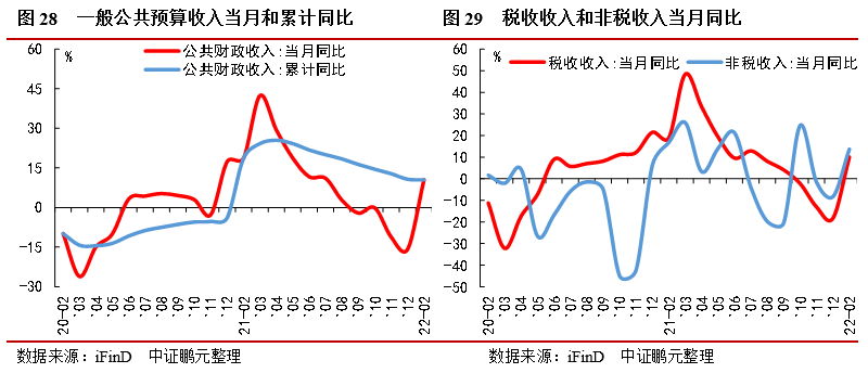 全國公共財政收入明顯加快,稅收和非稅收入均回升。1-2月累計,全國一般公共預算收入46,203億元,累計同比增長10.5%,前2月累計財政收入占全年預算收入比重達到22.0%,處同期高位;從當月同比來看,扭轉負增長態勢,大幅高于去年12月當月同比增速-15.8%,開局表現良好。拆分來看,稅收收入、非稅收入同比增長10.1%、13.7%,去年12月同比為-18.3%、-8.3%,增速由負轉正大幅提高,非稅收入增速略高于稅收收入增速,主因今年非稅收入的特定國有金融機構上繳利潤(前2年暫停繳納),今年非稅收入有較大的增長空間。資源稅、個人所得稅大幅增長,同比增速為92.2%、46.8%,土地增值稅同比下降1.4%。