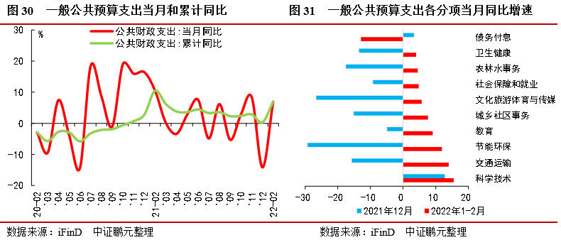 全國公共財政支出回升,靠前發力,基建支出加快。1-2月累計,全國一般公共預算支出38,227億元,同比增長7.0%,較2021年全年同比0.3%明顯上升,大幅高于2021年12月當月同比-14.2%。前2月的財政支出占全年預算支出的比重達到14.3%,創同期新高,體現了積極的財政政策,發力靠前。分結構來看,10個支出分項中累計同比增速由高至低:科學技術(15.5%)、交通運輸(14.0%)、節能環保(11.9%)、教育(9.1%)、城鄉社區事務(7.6%)、文化旅游體育與傳媒(5.7%)、社會保障和就業(7.8%)、農林水事務(3.5%)、衛生健康(4.0%)、債務付息(-12.9%)。基建支出(交通運輸、城鄉社區事務、農林水事務)表現較快增長,1-2月增長8.0%,大幅高于去年12月單月同比-16.4%、也高于去年12月兩年平均增速-4.8%。民生性支出(衛生健康、社會保障和就業、教育)也表現較好,科學技術支出增速最快。