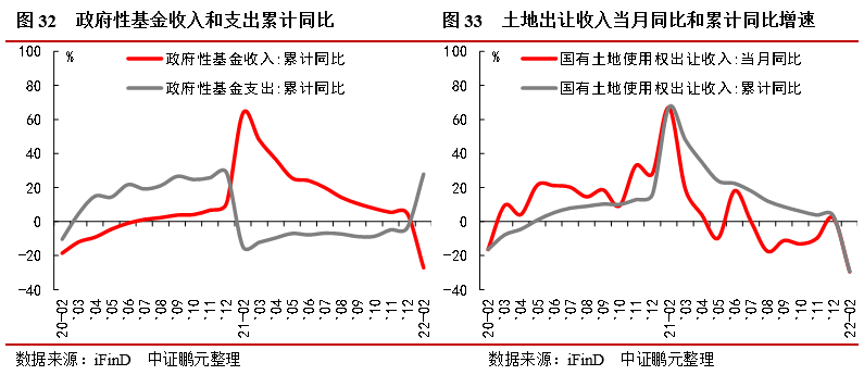 政府性基金收入負增長,主要受土地出讓金拖累。1-2月累計,全國政府性基金預算收入9,159億元,同比下降27.2%,由正轉負大幅減少,去年全年增速為4.8%。其中,國有土地使用權出讓收入7,922億元,同比下降29.5%,低于去年全年同比3.5%,也低于去年12月當月同比2.2%,在商品房銷售、竣工同比繼續回落情況下,地產表現低迷,土地出讓金銳減也是預料之中,是政府性基金預算收入主要拖累因素。