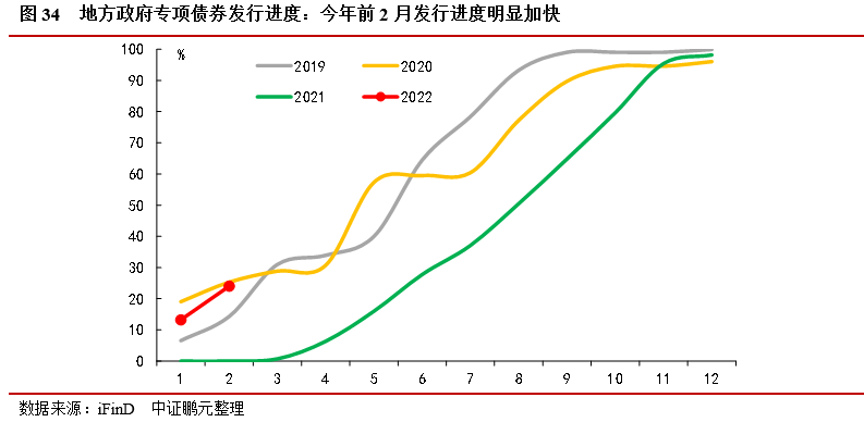 政府性基金支出加快,專項債發行前置。1-2月累計,全國政府性基金預算支出14,042億元,同比增長27.9%,支出加快,大幅高于去年全年的-3.7%增速。1-2月新增專項債共計發行8,775億元,占提前批額度的60.1%,較去年同期明顯加快。1-2月專項債累計發行進度為24.0%,明顯高于2019年和2021年同期增速,接近2020年25.3%的發行進度,專項債整體節奏靠前發力,加快政府性基金支出。