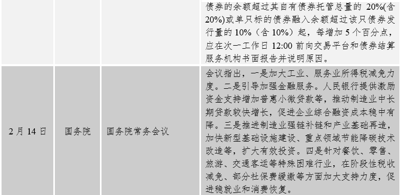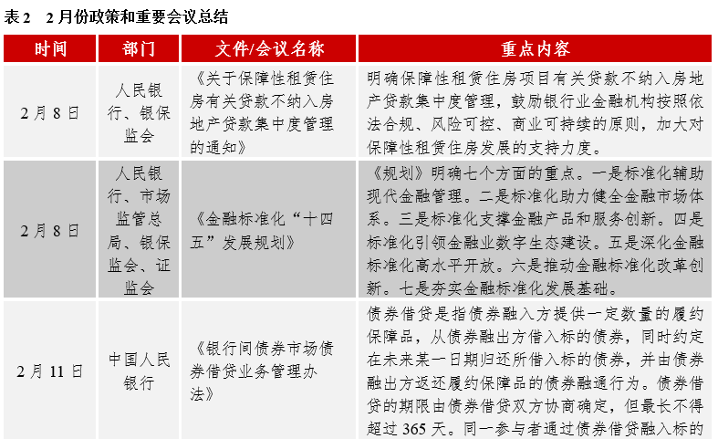 債券市場制度建設方面:2月8日,人民銀行、市場監管總局等部門聯合印發《金融標準化“十四五”發展規劃》,明確七個方面的重點,提出到2025年,與現代金融體系相適應的標準體系基本建成,金融標準化的經濟效益、社會效益、質量效益和生態效益充分顯現,標準化支撐金融業高質量發展的地位和作用更加凸顯。展望2035年,科學適用、結構合理、開放兼容、國際接軌的金融標準體系更加健全,市場驅動、政府引導、企業為主、社會參與、開放融合的金融標準化工作格局全面形成,標準化成為支撐金融業高質量發展的重要力量。2月8日,人民銀行、銀保監會明確保障性租賃住房項目有關貸款不納入房地產貸款集中度管理,加大對保障性租賃住房發展的支持力度。2月11日,人民銀行發布《銀行間債券市場債券借貸業務管理辦法》,對債券借貸對象、要求、期限等進行了規定,增加了集中債券借貸業務。