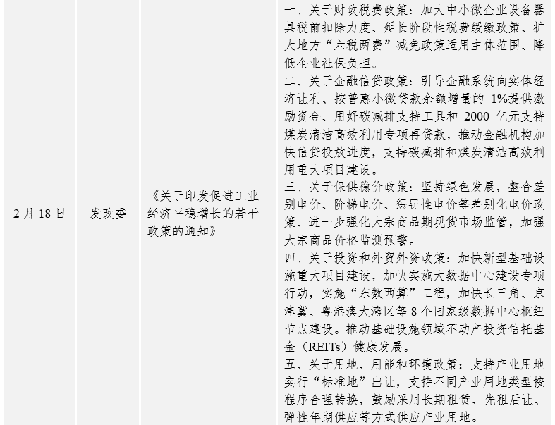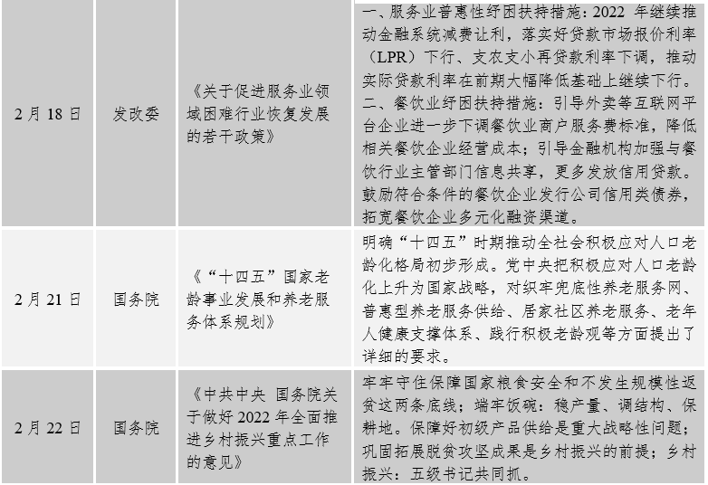 宏觀經濟設計方面:主要圍繞穩增長出臺一系列政策和措施。中共中央政治局召開會議,討論國務院擬提請第十三屆全國人民代表大會第五次會議審議的《政府工作報告》稿。會議強調,堅持穩中求進工作總基調,著力穩定宏觀經濟大盤,保持經濟運行在合理區間,保持社會大局穩定,迎接黨的二十大勝利召開。今年工作要堅持穩字當頭、穩中求進。要加大宏觀政策實施力度,堅定實施擴大內需戰略,推動外貿外資平穩發展,防范化解金融風險,守住不發生系統性風險的底線,努力完成全年經濟社會發展目標任務。國務院常務會議要求加大工業、服務業、消費業所得稅減免力度,支持增加普惠小微貸款等,推動制造業中長期貸款較快增長,促進企業綜合融資成本穩中有降,加快新型基礎設施建設、重點領域節能降碳技術改造等,擴大有效投資。發改委相繼印發了《關于印發促進工業經濟平穩增長的若干政策的通知》、《關于促進服務業領域困難行業恢復發展的若干政策》、《關于進一步完善煤炭市場價格形成機制的通知》,加大工業、服務業、煤炭業的支持措施。