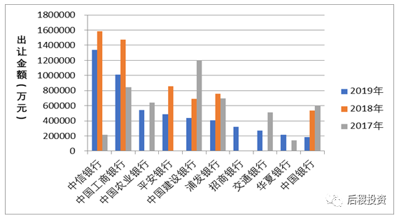 經(jīng)過(guò)數(shù)據(jù)整理,我們發(fā)現(xiàn)共有53家銀行的交易記錄,其中出讓金額最大的是中信銀行,達(dá)到134.1億元。五大國(guó)有銀行均位列上表所示前十大銀行,前十大銀行全年累計(jì)出讓資產(chǎn)金額約521億元,所占比重接近八成。另外,圖二我們也能更直觀感受銀行三年變化,比如中信銀行和工商銀行出讓金額這兩年保持前二;建設(shè)銀行、中國(guó)銀行等出讓金額逐年減少;