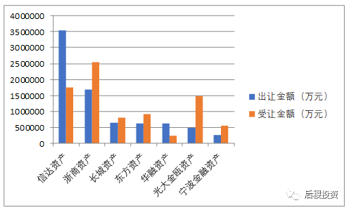 圖中數(shù)據(jù)為持牌AMC在整個(gè)不良市場(chǎng)所有收包、出包金額統(tǒng)計(jì)。從對(duì)比數(shù)據(jù)上看,僅信達(dá)資產(chǎn)和華融資產(chǎn)出讓金額>受讓金額;長(zhǎng)城資產(chǎn)收、出包金額相對(duì)平衡。