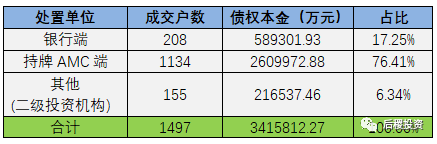從阿里拍賣平臺(tái)中篩選出浙江地區(qū)債權(quán)(超過(guò)1000萬(wàn))成交記錄,總成交戶數(shù)1497戶,成交債權(quán)總本金341.6億,總成交價(jià)157.8億元,其中持牌AMC出讓比重接近80%。