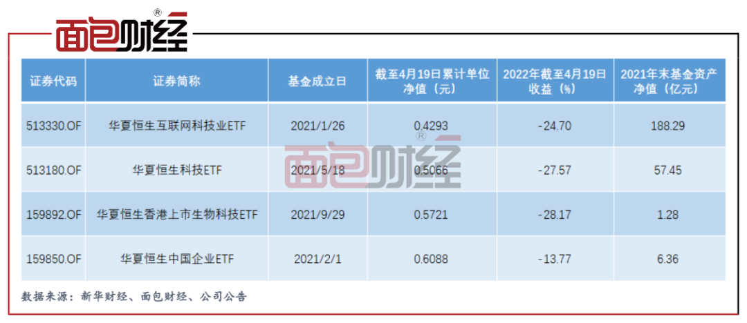 華夏恒生互聯(lián)網(wǎng)科技業(yè)ETF(QDII)、華夏恒生科技ETF(QDII)是華夏基金旗下規(guī)模靠前的產(chǎn)品。截至2022年4月19日,這兩只產(chǎn)品的累計(jì)單位凈值分別跌至0.4293元和0.5066元,今年以來(lái)分別下跌24.70%和27.57%。