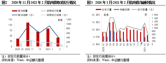 2020年10月后,華晨集團、永煤控股相繼出現違約,作為高級別國有企業,此次違約,引發市場對高級別企業的風險擔憂,同時對國有企業、煤炭行業、河南省其他企業的融資帶來明顯的負面影響。根據Wind數據,2020年11月以來,推遲或發行失敗的債券共計366只,原計劃發行2,845.41億元,其中,91只已擇期發行。信用債凈融資在11月由正轉負,2021年受政策對沖,市場1月份凈融資轉正。