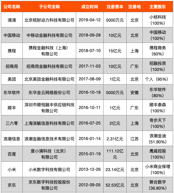 除銀行、保險、證券業(yè)持牌機構(gòu)外,移動通信、電子商務(wù)、互聯(lián)網(wǎng)等行業(yè)巨頭也積極布局金融科技領(lǐng)域,成立金融科技子公司整合內(nèi)外部資源以降低成本、挖掘資源,從而助力集團實現(xiàn)利益的最大化。本文簡要統(tǒng)計了20家此類其他金融科技子公司的相關(guān)信息。