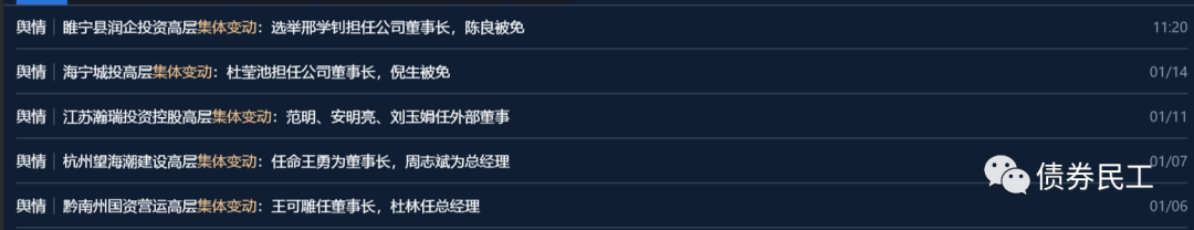 當(dāng)然高管集體變動(dòng)并不意味著是所有董事、監(jiān)事和高級(jí)管理人員都發(fā)生變動(dòng),一般3個(gè)人以上的變動(dòng)就屬于集體變動(dòng)。從公開(kāi)披露的信息來(lái)看,近期城投公司高管集體發(fā)生變動(dòng)的情況好像有點(diǎn)多,僅在2022年1月份就披露了5個(gè):