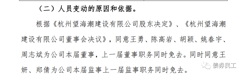 4、2022年1月7日,杭州望海潮建設(shè)有限公司公告稱,公司上一屆的全部董事和全部監(jiān)事同時(shí)發(fā)生變動(dòng)。
