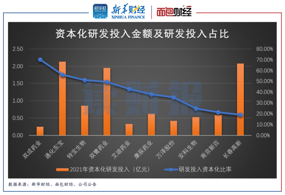 但另一方面,通化東寶研發(fā)投入資本化比例明顯較高。數(shù)據(jù)顯示,公司2021年合計(jì)3.80億元的研發(fā)投入中,資本化的金額為2.13億元,占比達(dá)56.11%。