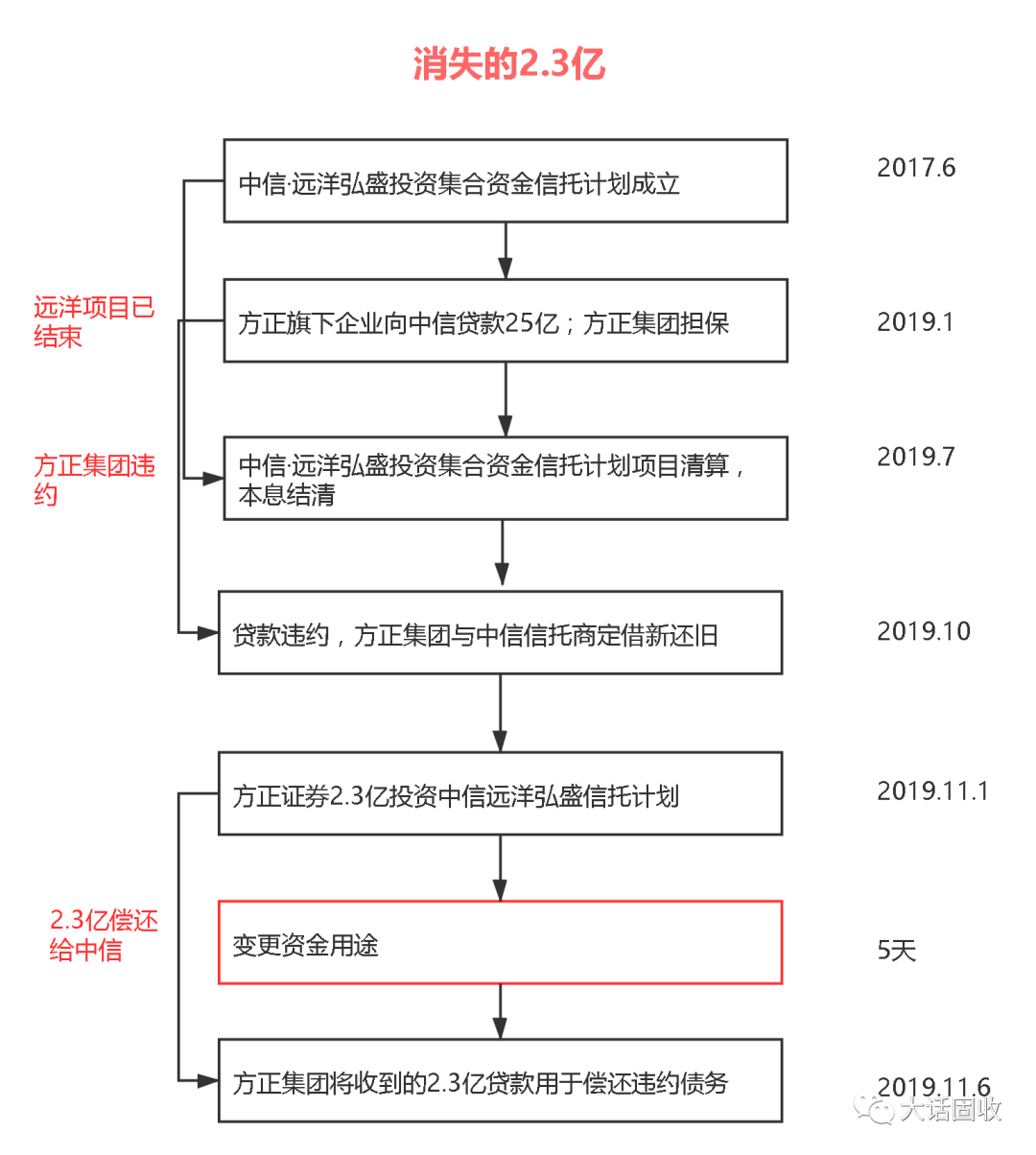 這樣來看,時間線就更有意思了,方正集團的貸款和遠洋信托計劃的清算是交叉進行的: