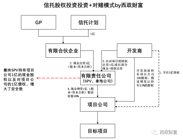1. 信托計劃投資有限合伙L(fēng)P份額(即1億)對有限責(zé)任公司SPV進(jìn)行增資,部分進(jìn)入實收資本,大部分進(jìn)入資本公積。開發(fā)商則以對項目公司的債權(quán)(或債權(quán)+部分現(xiàn)金)對SPV進(jìn)行出資。