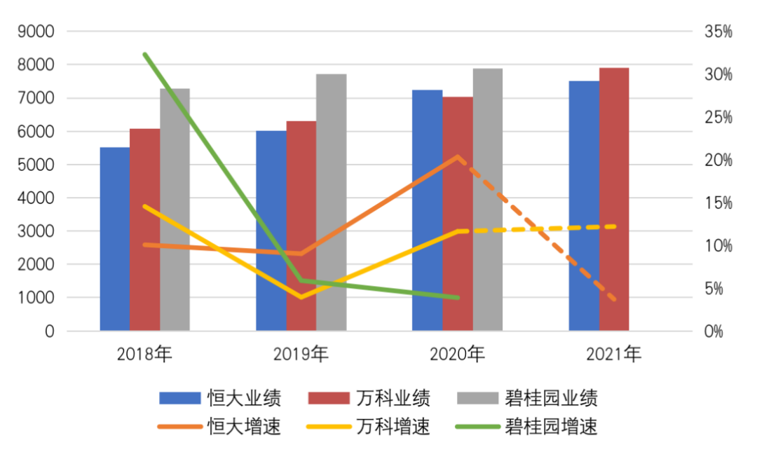 萬科將2021年銷售目標定在7900億元,意味著2021年增長率要達到12%。目前,行業前三銷售規模均超過了7000億元,分別是碧桂園、恒大、萬科,其中,碧桂園于2018年突破7000億,隨后2年都保持了個位數的低速增長,恒大在大跨步邁入7000億之后,將2021年的銷售目標定在7500億,增速降至3.7%,僅萬科在行業“零增長”甚至是“負增長”預期下,選擇“高位起跳”。