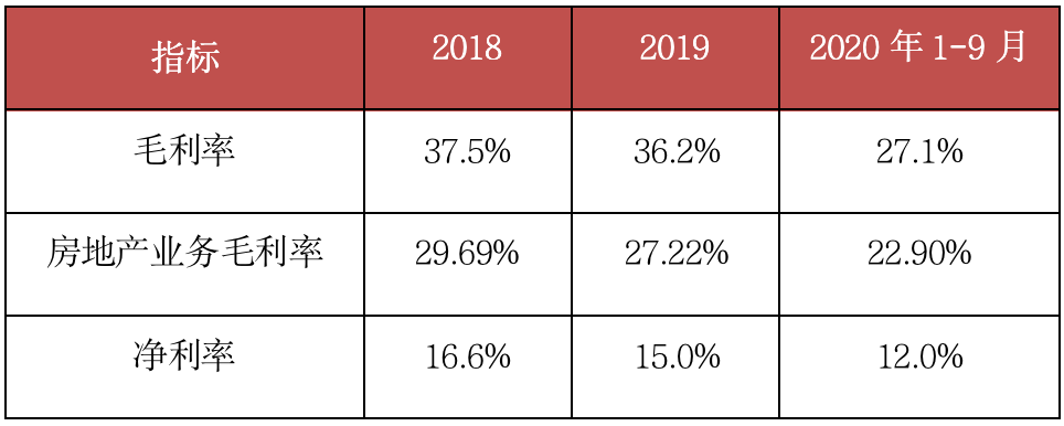 數據顯示,近兩年來,萬科無論是毛利率還是凈利率都在走低,2020年1-9月毛利率為27.1%,其中房地產開發及相關資產經營業務收入毛利率為22.9%,凈利率為12%,都低于前兩年水平。