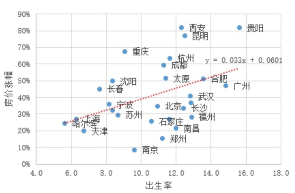 就一二線城市來看,出生率越高的城市,房價上漲幅度也越大,典型如西安、貴陽,房價漲幅均在8成以上;而出生率比較低的天津、哈爾濱,其房價漲幅均未超過25%。