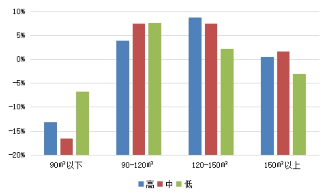 與此同時,受“全面二胎”政策影響,近年來住宅市場產(chǎn)品成交結(jié)構(gòu)向中大面積產(chǎn)品傾斜,據(jù)典型城市在2016-2019年間的住宅成交結(jié)構(gòu)來看,期間出生率增加的城市,其120-150平方米面積段的住宅產(chǎn)品市場份額均是增加的,平均增幅顯著高于出生率下降的城市。這說明出生率提升,住宅市場上改善需求也會相對較多,對中大戶型面積段的產(chǎn)品需求比例也會因此上漲。