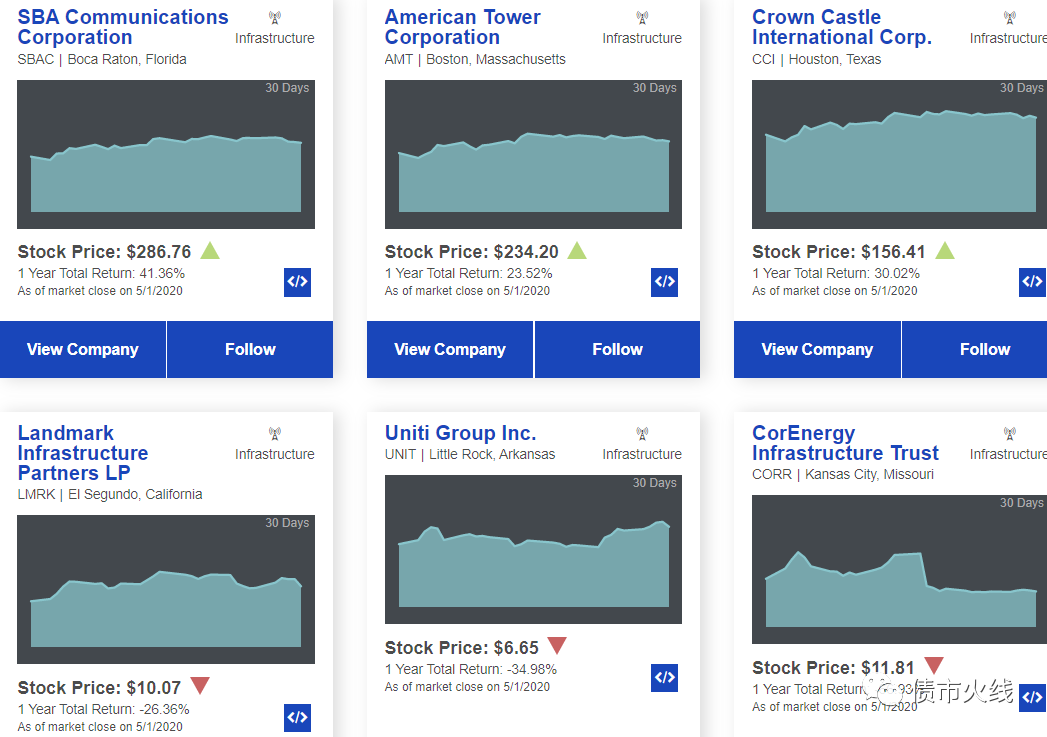 截至目前,根據(jù)Nareit網(wǎng)站披露的信息,美國基礎設施REITs(infrastructure REITs)一共有六只,如下圖所示: