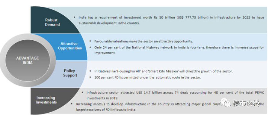 但是印度和中國都算發(fā)展中國家,人口、地域版圖有較高可比性,過去幾十年以及未來一段時間,地產(chǎn)和基礎設施投資建設需求旺盛,政府都有動力追求進一步便民利民,保持經(jīng)濟增長活力。根據(jù)IBEF(Indian Brand Equity Foundation)今年2月發(fā)布的研究報告,印度基礎設施投資建設增長迅速,且未來發(fā)展?jié)摿薮蟆?/p>