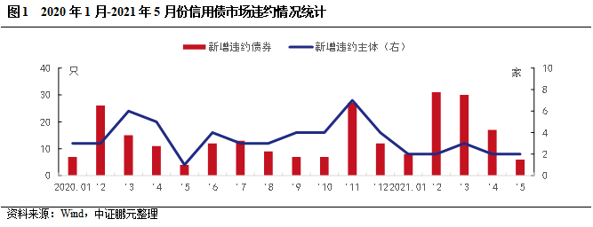 2021年5月新增違約債券僅6只,其中,新增違約主體僅2只違約,其余均為已違約主體存續債券。從行業看,地產公司違約債券4只,均為已違約主體,其余違約行業為采掘和機械設備。本次以地產公司風險處置為重點分析對象。