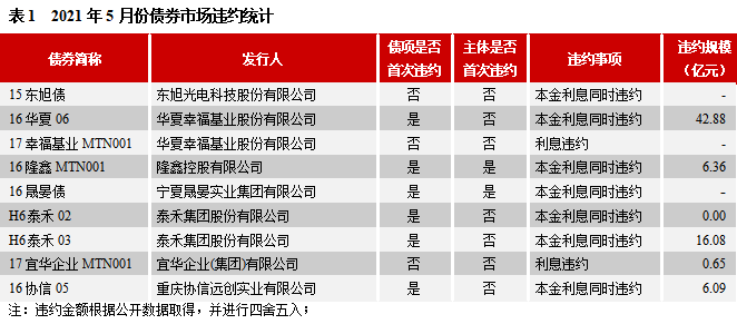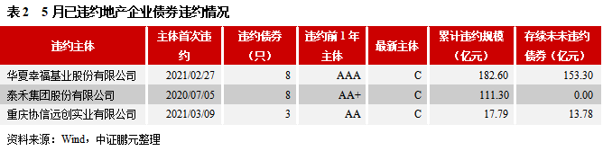 2021年5月,已違約主體泰禾集團股份有限公司(簡稱“泰禾集團”)、華夏幸?;鶚I股份有限公司(簡稱“華夏幸?!保┖椭貞c協信遠創實業有限公司(簡稱“重慶協信”)的存續債券繼續出現違約。截至2021年5月末,華夏幸福尚有存續債券153.30億元,其中有33億元在2021年面臨到期或回售;重慶協信尚有存續債券13.78億元,在7月和9月到期;泰禾集團所有發行債券均已到期或違約。