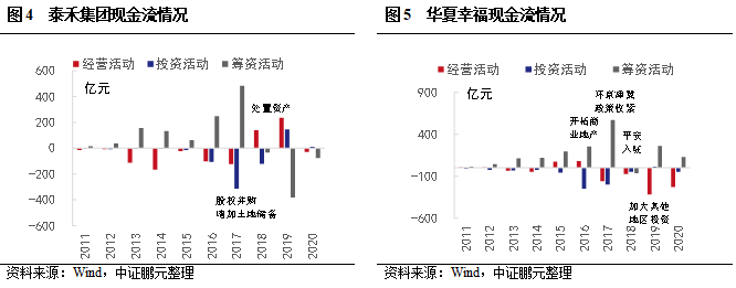 在泰禾集團、華夏幸福和重慶協信的現金流分布中可以看到,經營活動現金流凈額常年為負,籌資活動現金流常年為正,當出現大額投資時,在投資支出年份的前后會出現籌資規模大幅攀升的情況。但投資后經營活動現金流在改善之前,出現行業政策收緊、新冠疫情等負面事件,隨后開始處置子公司、收回投資或引入戰略投資者來獲取流動性,但由于債務集中兌付,再融資受項目類型、公司債務規模等限制,公司很難快速獲得足額兌付資金。例如,泰禾集團存量項目再投資規模較大,且受限比例較高,項目為高端住宅周轉率低,處置難度較大;華夏幸福業務相對集中,受區域政策影響較大,存量項目因多與政府合作,流動性較弱,且新開拓業務尚處于投資前期。