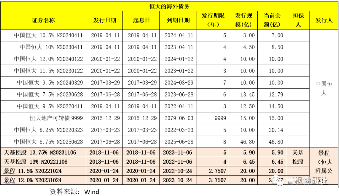 (五)初步統(tǒng)計(jì),境外直接債務(wù)227億美元,具體包括公開市場(chǎng)發(fā)行的142億美元債券、景程發(fā)行的52億美元、33億美元項(xiàng)目融資與私募融資等其它債務(wù)。另存在恒大境外主體為境內(nèi)融資提供的保證擔(dān)保、回購(gòu)承諾等或有債務(wù)(具體信息未公布),目前正在梳理或有債務(wù)的相關(guān)細(xì)節(jié)。也即境外債務(wù)底數(shù)還未摸清。