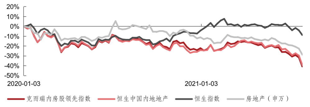與之相對應的是,自去年以來A股、港股地產股整體表現低迷??硕鹱C券監測數據顯示,2020年1月1日至今,克而瑞內房股領先指數跌幅40.7%,同期恒生中國內地地產指數跌幅39.3%。