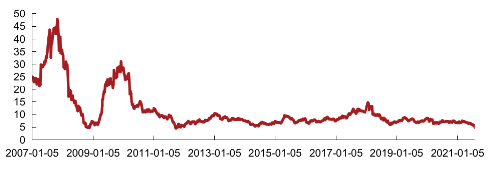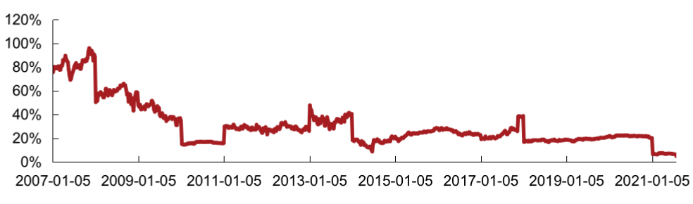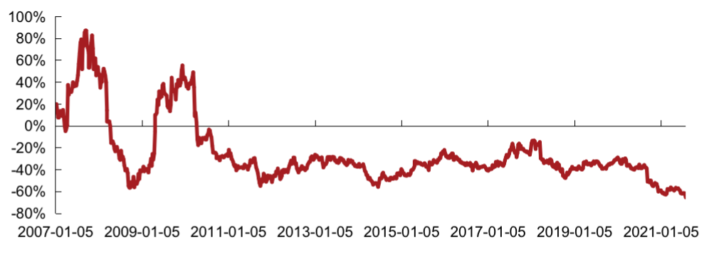 2021年7月相對恒指成分股的PE周均值為-62.4%,低于上月相對PE周均值-60.1%,低于2020年全年相對PE周均值-41.3%??硕饍确抗深I先指數成分股整體PE 2021年7月周均值為5.55,低于上月周均值6.24,低于2020年全年周均值7.17。