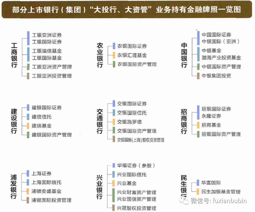 在金融市場化和去杠桿的大背景下,經濟發展方式的轉變和結構調整必然引發社會融資結構的深刻變化,由此導致原先以銀行信貸資金凝結而成的經濟結構體系發生顛覆式調整,跨業、跨界經營為銀行業提供了巨大的發展空間,在既有的分業監管、分業經營格局下,各家銀行在合法合規的基礎上,借助直接、間接控股或集團內關聯的方式,將券商、信托、基金、資產管理公司、股權投資公司的金融牌照進行整合,開辟新的增長空間,推動銀行轉型發展,而圍繞相關業務搭建的金融集團框架也日漸成型: