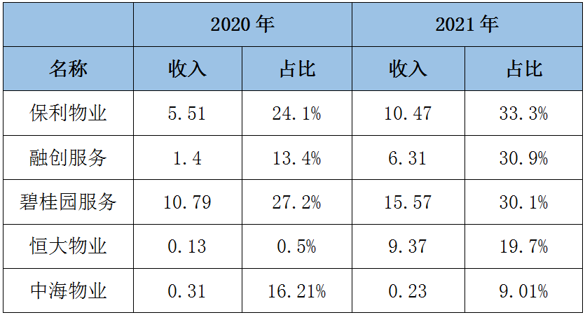 物業市場上,多數頭部上市物業公司的業務拓展都比較依賴母公司,與第三方開發商合作不多。例如,截至2021年6月,中海物業僅有9.01%的物業管理服務收入來自第三方開發商,保利物業的物業管理服務收入中,也僅有33%的比例來自第三方。